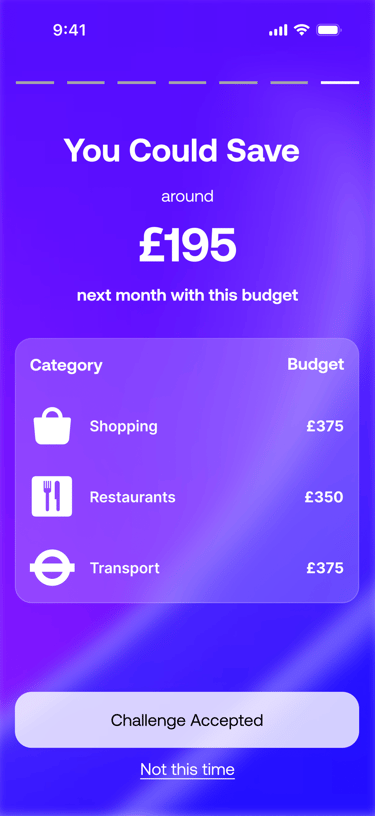 The app dynamically adjusted goals based on user progress, keeping them realistic yet motivating. This approach transformed passive tracking into actionable insights, guiding users toward smarter spending and meaningful savings with clear, achievable targets.
